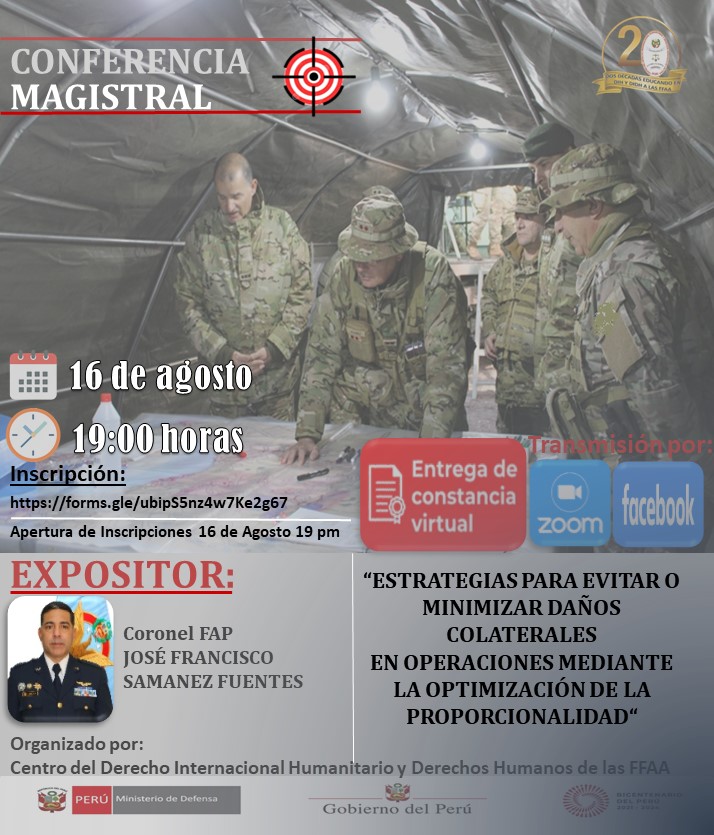 𝗘𝗹 𝗖𝗲𝗻𝘁𝗿𝗼 𝗱𝗲𝗹 𝗗𝗲𝗿𝗲𝗰𝗵𝗼 𝗜𝗻𝘁𝗲𝗿𝗻𝗮𝗰𝗶𝗼𝗻𝗮𝗹 𝗛𝘂𝗺𝗮𝗻𝗶𝘁𝗮𝗿𝗶𝗼 𝘆 𝗗𝗲𝗿𝗲𝗰𝗵𝗼𝘀 𝗛𝘂𝗺𝗮𝗻𝗼𝘀 𝗱𝗲 𝗹𝗮𝘀 𝗙𝘂𝗲𝗿𝘇𝗮𝘀 𝗔𝗿𝗺𝗮𝗱𝗮𝘀 (CDIH-DDHH-FFAA) invita al personal de las Fuerzas Armadas a participar de la conferencia magistral “estrategias para evitar o minimizar daños colaterales en operaciones mediante la optimización de la proporcionalidad”