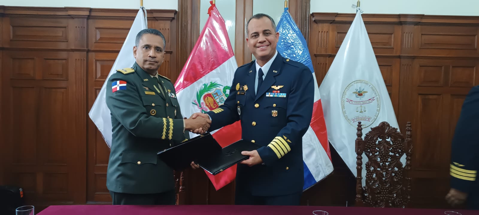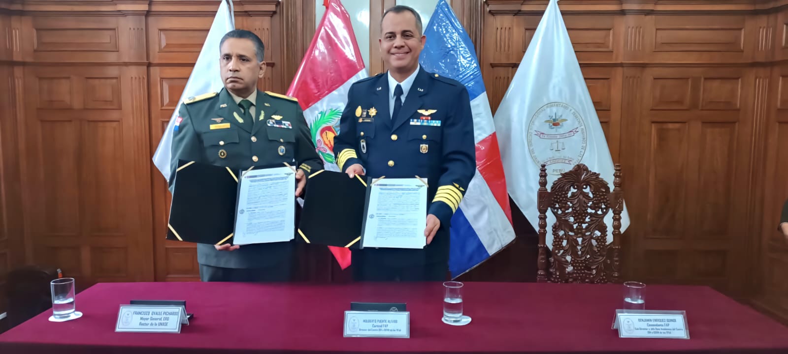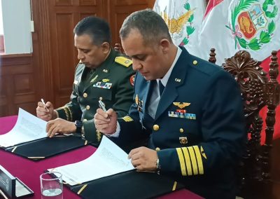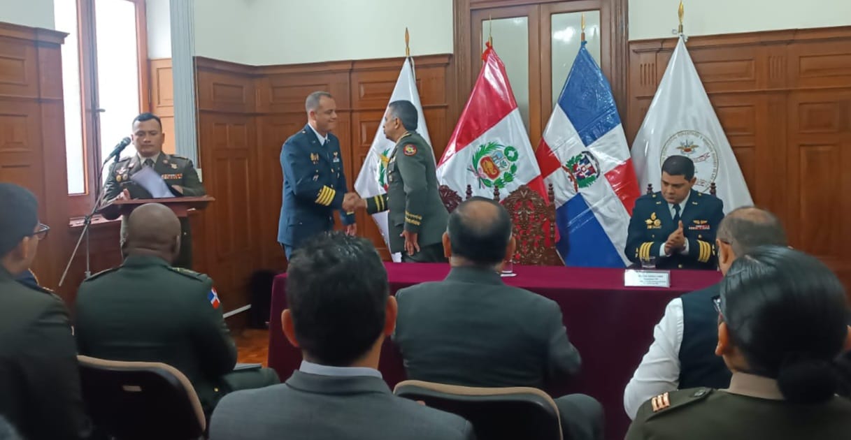 La suscripción del Convenio Marco fue realizada por el señor Mayor General 𝗙𝗿𝗮𝗻𝗰𝗶𝘀𝗰𝗼 𝗔𝗻𝘁𝗼𝗻𝗶𝗼 𝗢𝘃𝗮𝗹𝗹𝗲 𝗣𝗶𝗰𝗵𝗮𝗿𝗱𝗼, ERD, Rector de la Universidad Nacional para la Defensa “General Juan Pablo Duarte y Díez” de República Dominicana, y el Coronel FAP 𝗡𝗼𝗹𝗯𝗲𝗿𝘁𝗼 𝗟𝘂𝗶𝘀 𝗣𝘂𝗲𝗻𝘁𝗲 𝗔𝗹𝗳𝗮𝗿𝗼, Director del Centro del Derecho Internacional Humanitario y Derechos Humanos de las Fuerzas Armadas del Perú, y contó con la presencia del Inspector General del Ministerio de Defensa, General de División (r) 𝗝𝗼𝘀é 𝗔𝗹𝗯𝗲𝗿𝘁𝗼 𝗩𝗶𝘇𝗰𝗮𝗿𝗿𝗮 Á𝗹𝘃𝗮𝗿𝗲𝘇, y representantes de las Direcciones del Ministerio de Defensa y de otras Instituciones del Estado.